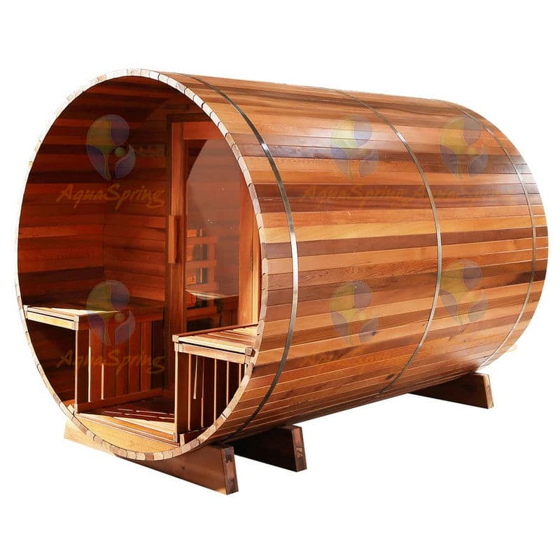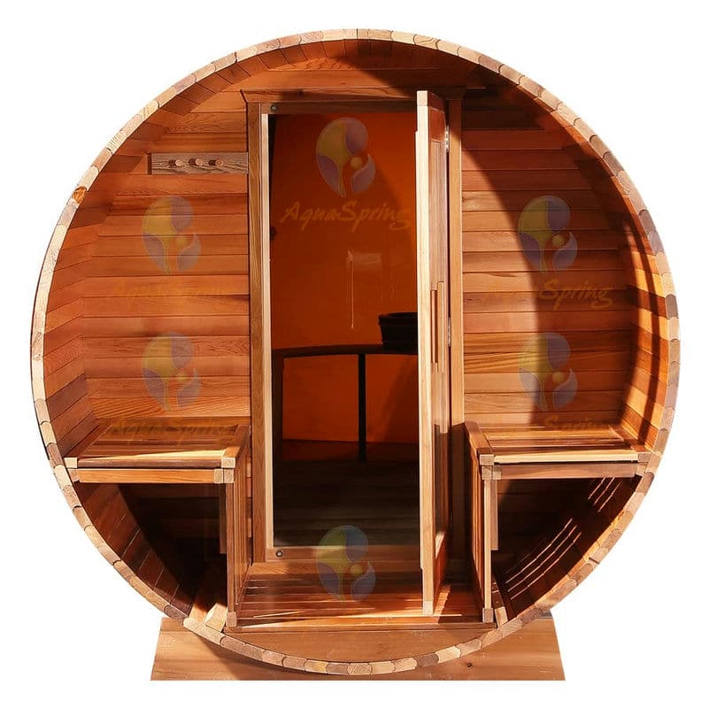 這款戶外傳統(tǒng)桑拿房為圓桶型設(shè)計(jì),標(biāo)準(zhǔn)直徑為1.8米,長度為3米,提供尺寸定制服務(wù),同時(shí)還提供玻璃球作為選配,用戶在享受桑拿的同時(shí)還擁有廣闊的視野,可以欣賞到戶外的自然風(fēng)光。該桑拿房入口處還設(shè)計(jì)了門廊以及兩個(gè)對(duì)向座椅,可以作為進(jìn)出桑拿房的一個(gè)過渡空間,幫助用戶在進(jìn)入桑拿前適應(yīng)溫度變化,也可以充當(dāng)一個(gè)休閑區(qū)域或者用于存放毛巾、拖鞋等個(gè)人用品,保持桑拿房內(nèi)部的清潔,以此為戶外桑拿房增添舒適感和便利性。