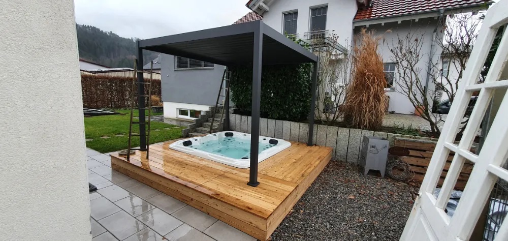 當(dāng)按摩浴缸安裝在一個(gè)露天的戶外環(huán)境之下,安裝一個(gè)戶外涼亭或者在戶外按摩浴缸旁放置羅馬傘,你便仿佛擁有了可以掌控陽光的神奇力量。羅馬傘以及戶外涼亭頂部的葉片可以隨意開合,調(diào)節(jié)陽光,甚至可以遮風(fēng)擋雨。它們的外觀時(shí)尚,可完美融入多種環(huán)境,同時(shí)為你的水療體驗(yàn)建立一個(gè)陽光屏障。